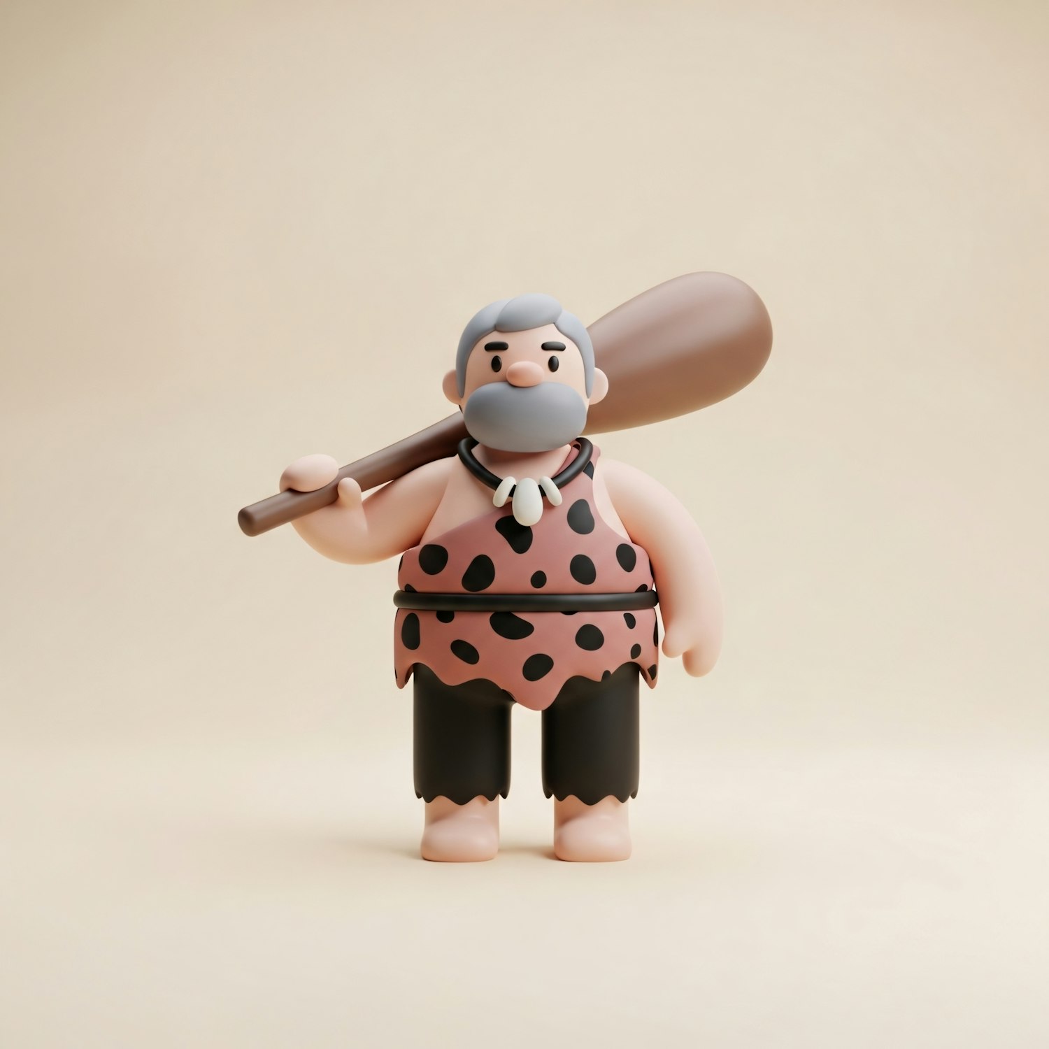 A cartoon caveman figure with a club, wearing a spotted tunic and bone necklace, set against a neutral background.