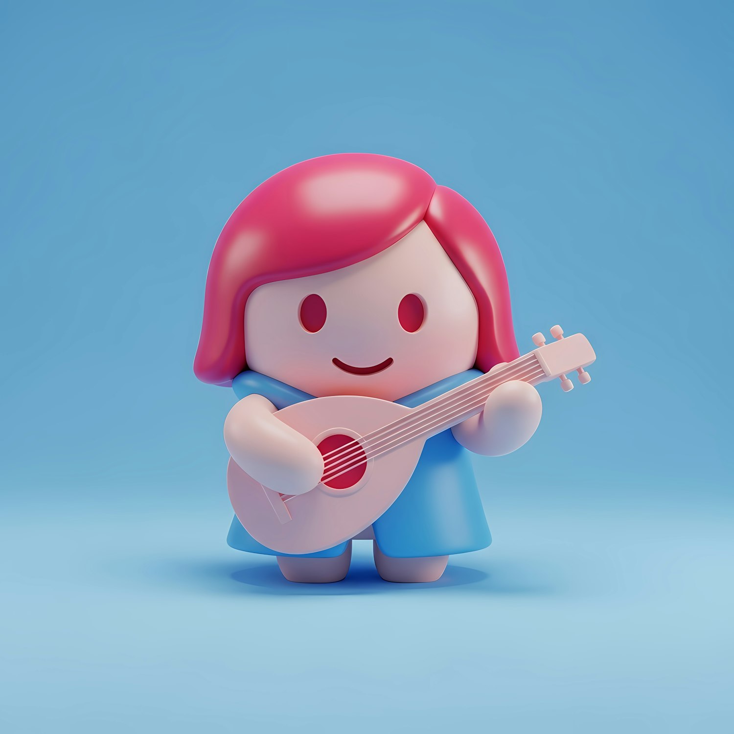 Adorable 3D cartoon character with pink hair playing a pink guitar, set against a light blue background. Perfect for cheerful designs.