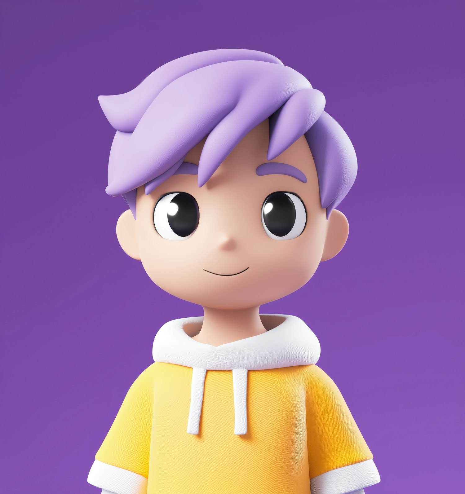 Cute 3D cartoon character with purple hair, big black eyes, and a yellow hoodie on a vibrant purple background.