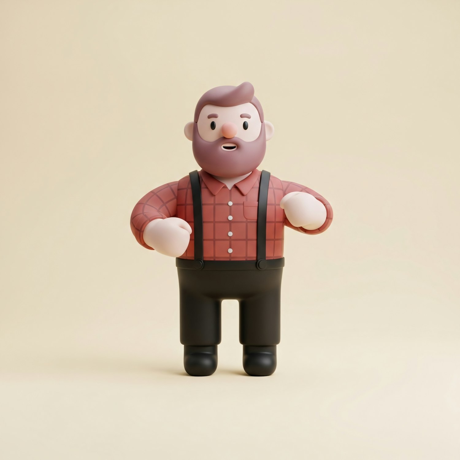 A charming 3D cartoon character with a beard, plaid shirt, and suspenders, set against a neutral beige background.