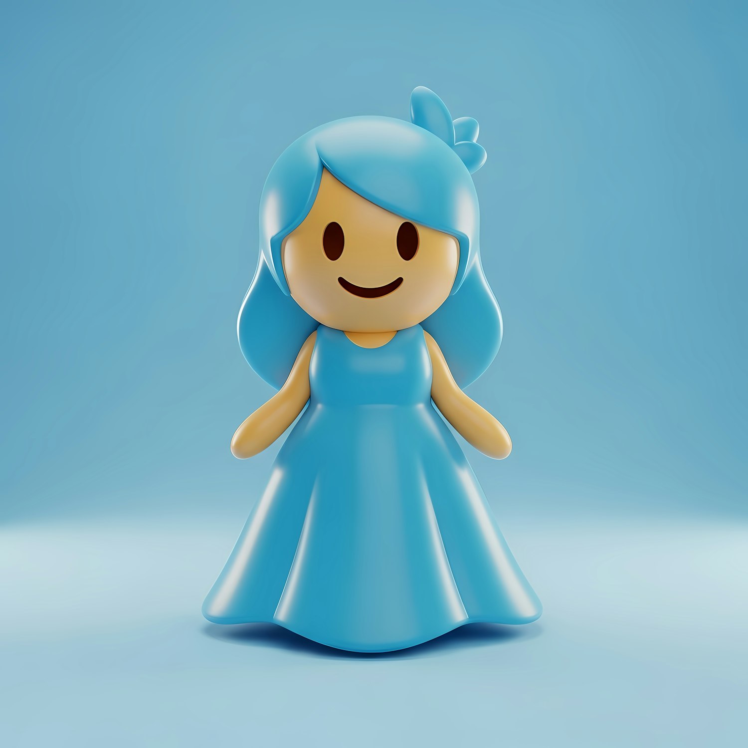 Adorable 3D cartoon character with blue hair and dress, smiling warmly against a soft blue backdrop. Perfect for playful designs.