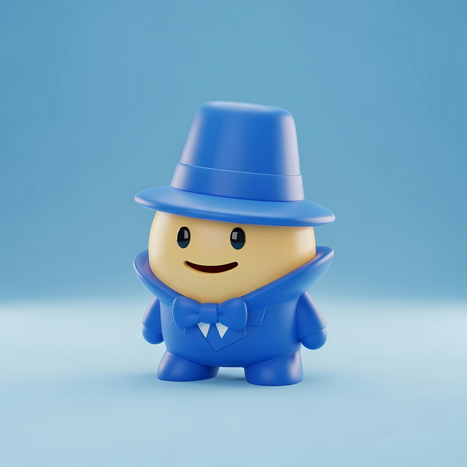 Adorable 3D cartoon character in a blue suit and hat, standing against a soft blue background. Perfect for creative projects!