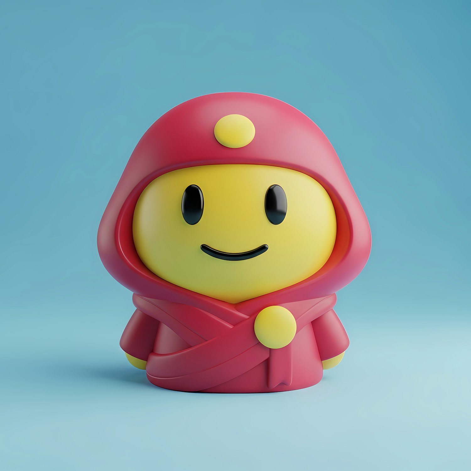 Adorable 3D cartoon character with a yellow face and red hooded robe, smiling warmly against a soft blue backdrop.