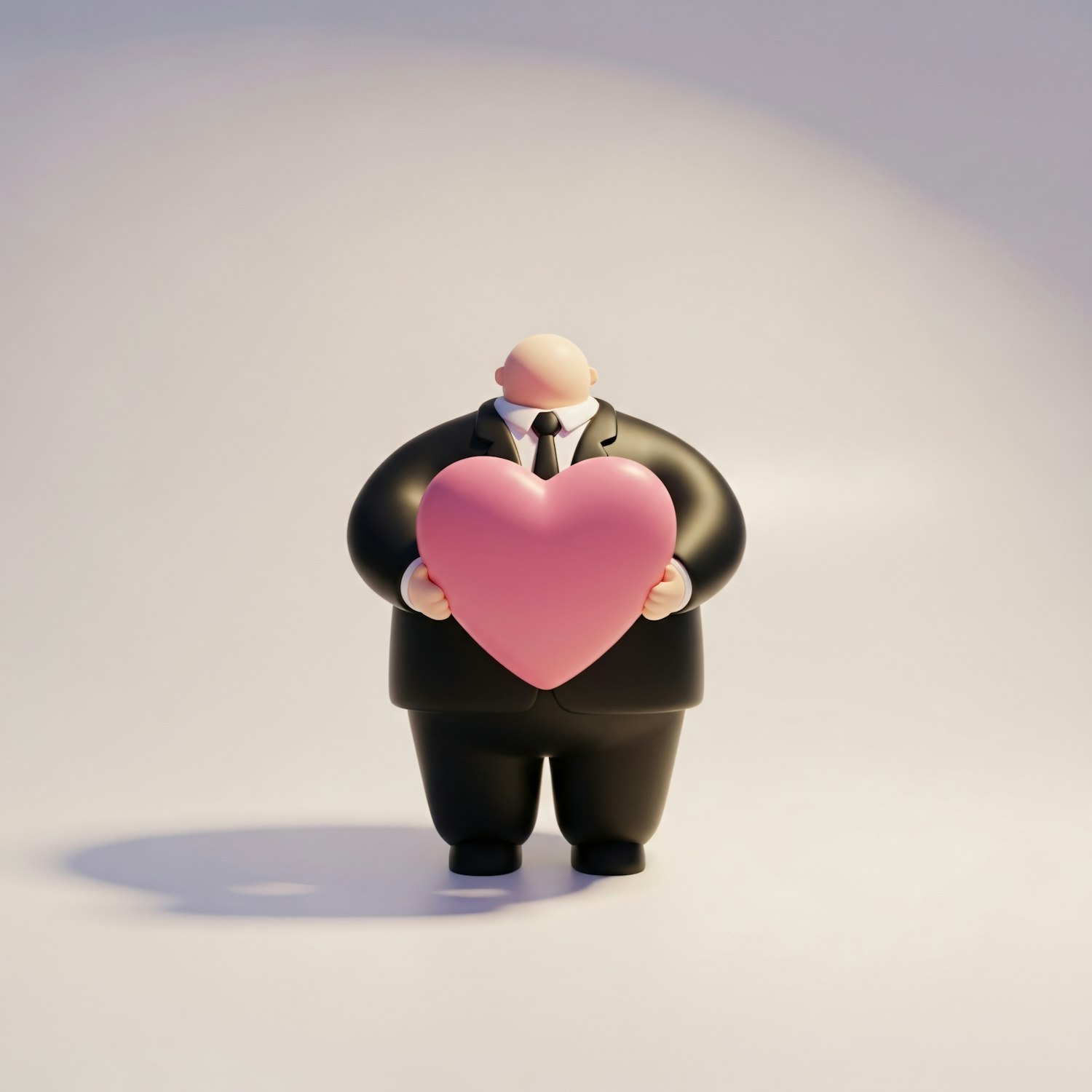 A 3D character in a suit holds a pink heart, set against a soft gradient background, creating a charming and minimalist scene.