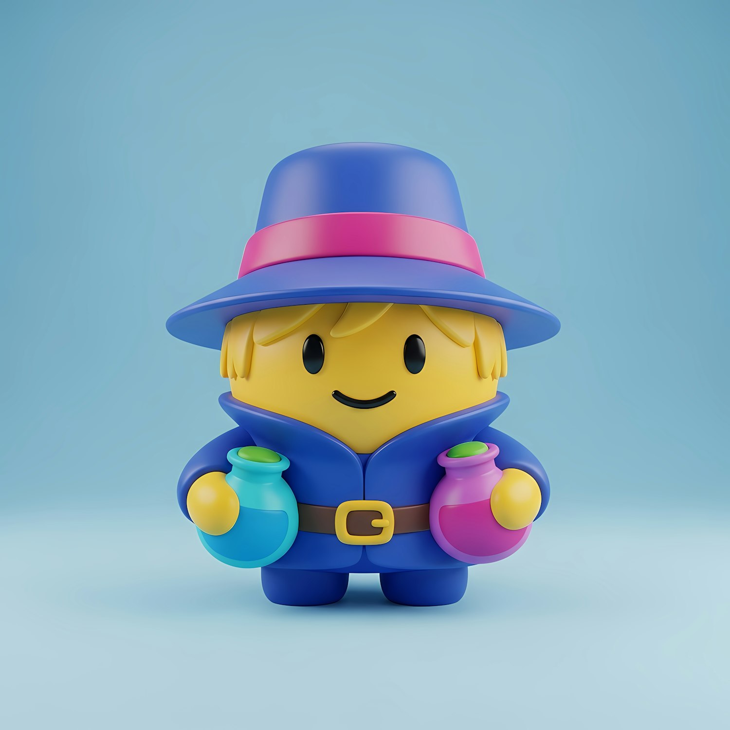 Adorable cartoon character in a blue outfit and hat, holding colorful potion bottles, set against a light blue background.