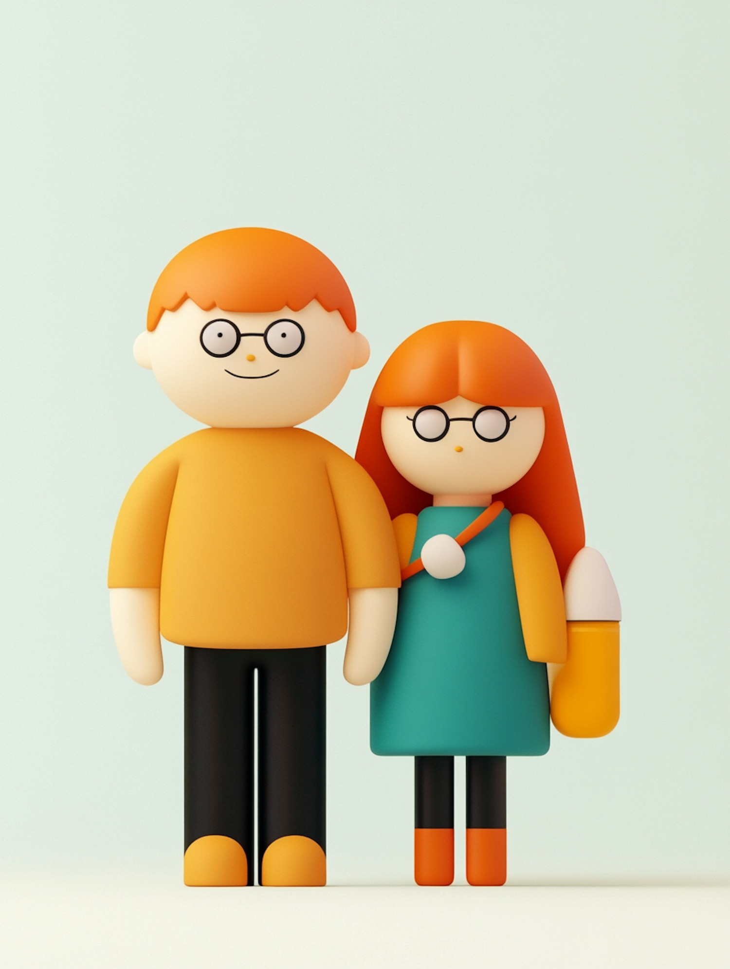 Whimsical cartoon characters with orange hair and glasses, wearing colorful outfits. Minimalist design with playful, rounded features.