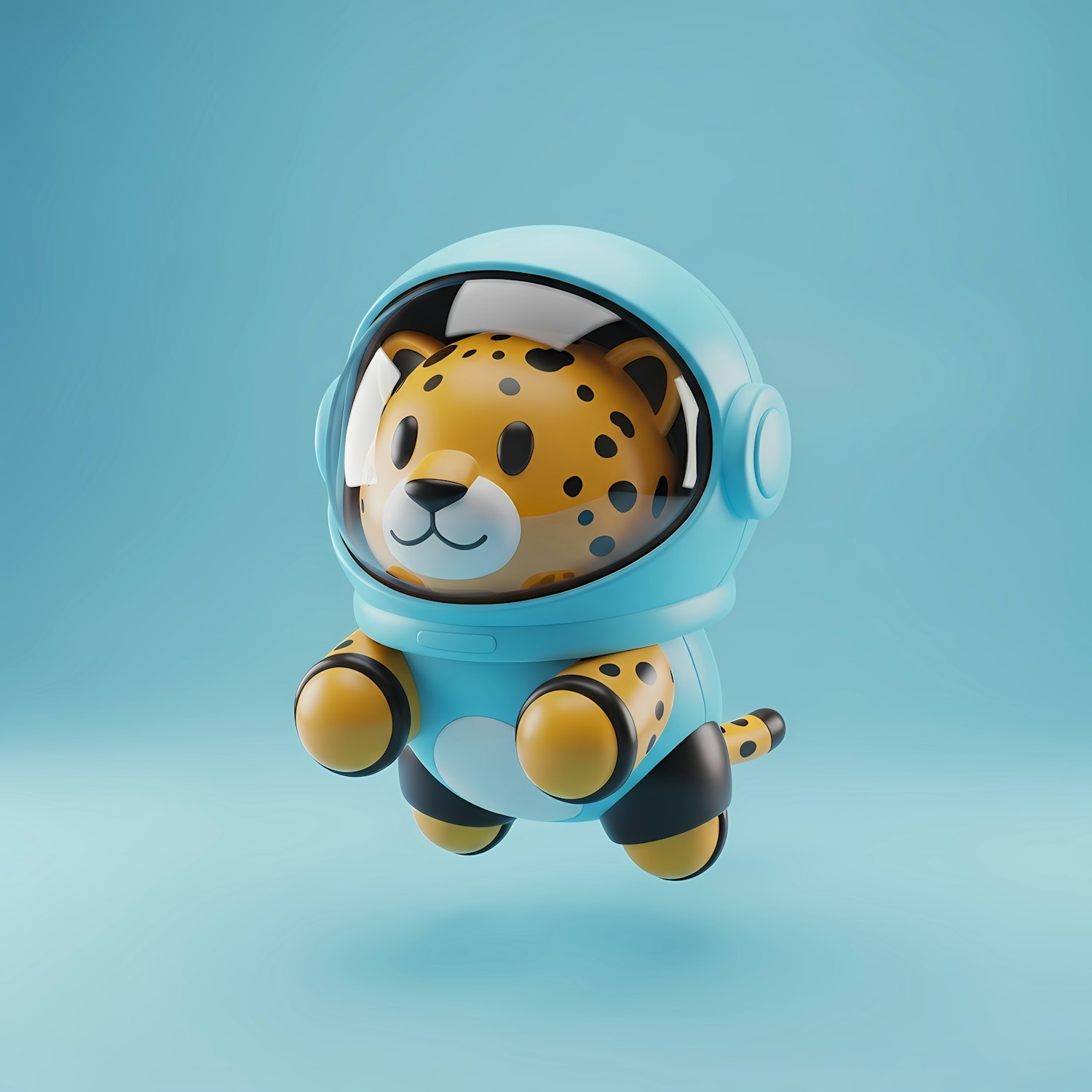 Adorable 3D cheetah in a blue astronaut suit, floating in a light blue background. Perfect for space-themed or children's content.