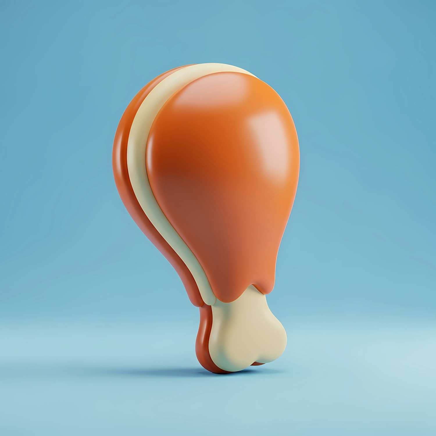 A playful 3D illustration of a glossy chicken drumstick with a light blue background, perfect for food-themed designs or creative projects.