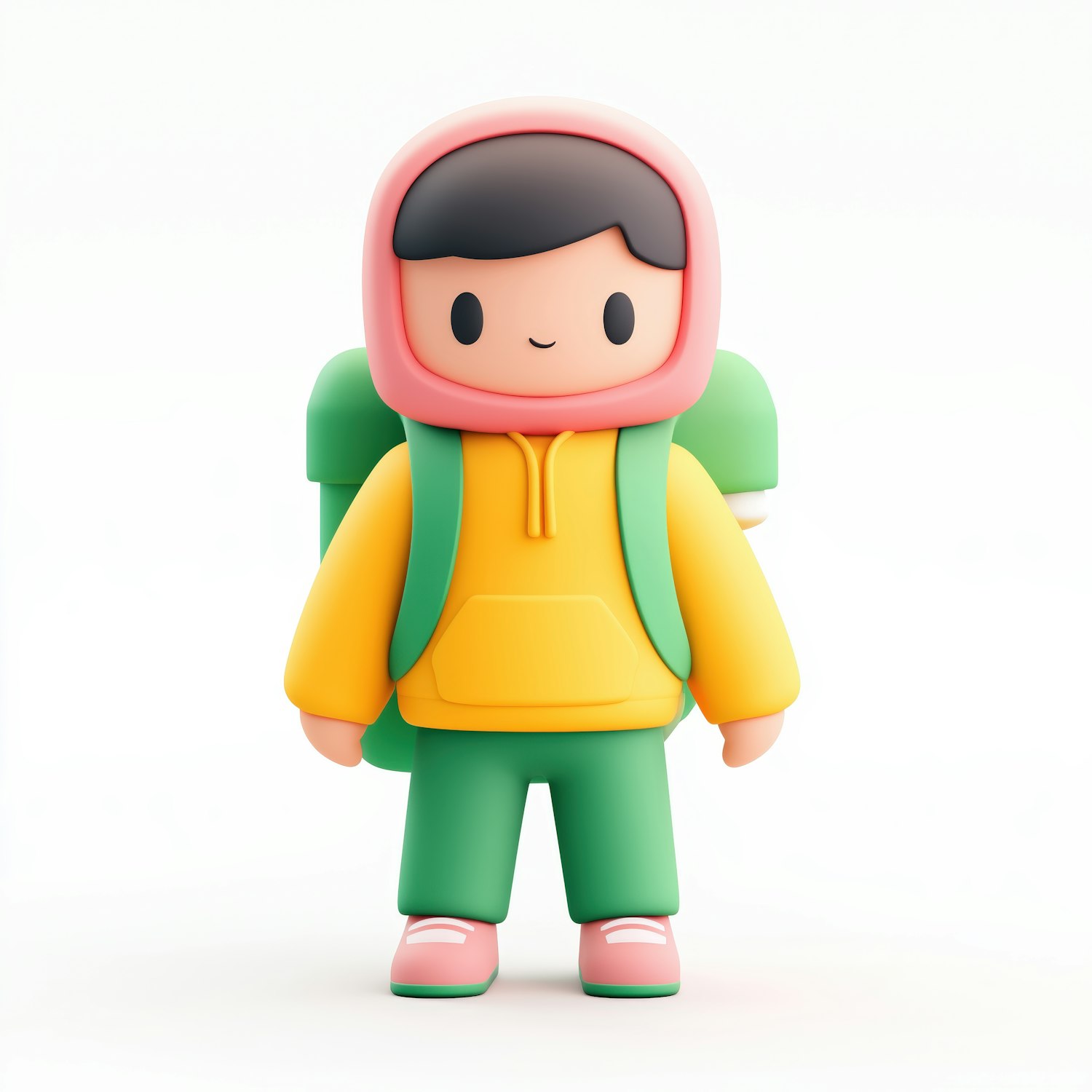 Adorable 3D cartoon character with a yellow hoodie, green pants, and a backpack, perfect for playful and kid-friendly designs.