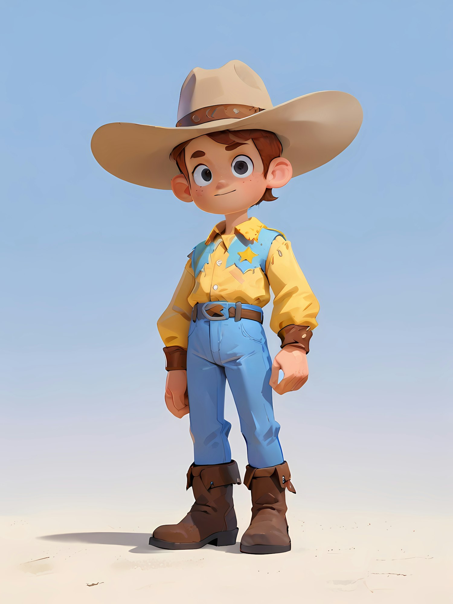 Adorable cartoon cowboy boy in a yellow shirt, blue jeans, and boots, standing confidently in a desert-like setting.