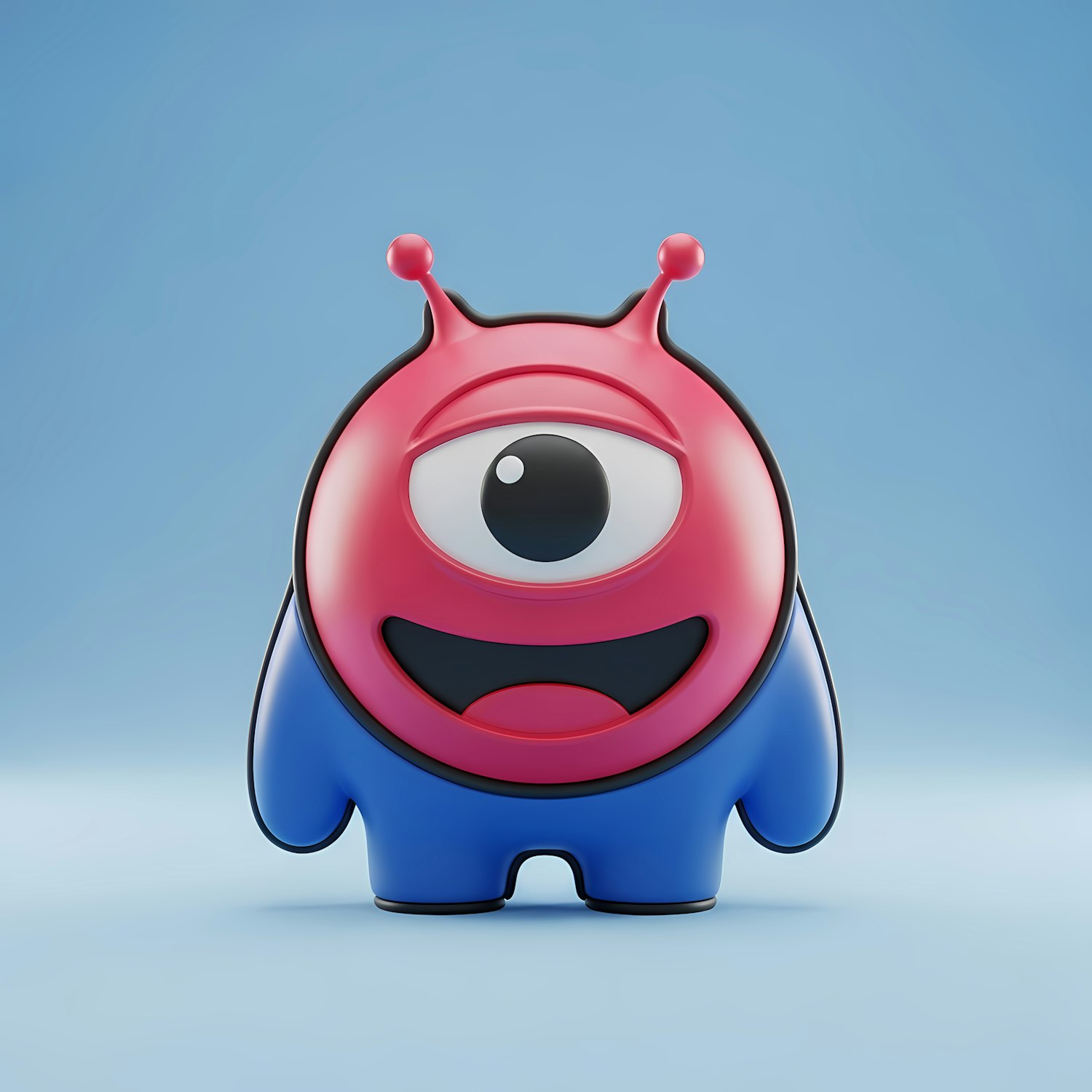 Adorable 3D cartoon character with a pink head, one big eye, and a blue body, standing against a soft blue backdrop.