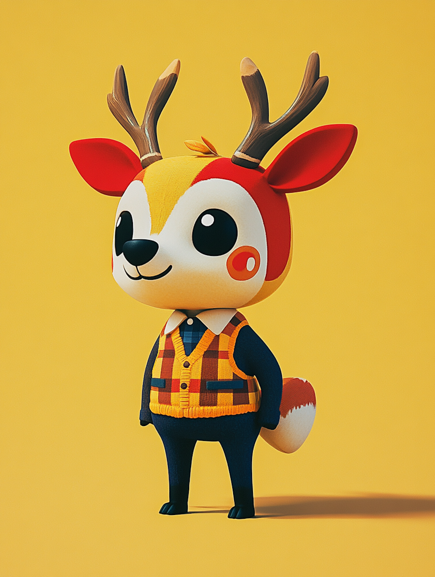 Adorable cartoon deer character with colorful antlers and plaid vest on a yellow background, exuding charm and playfulness.