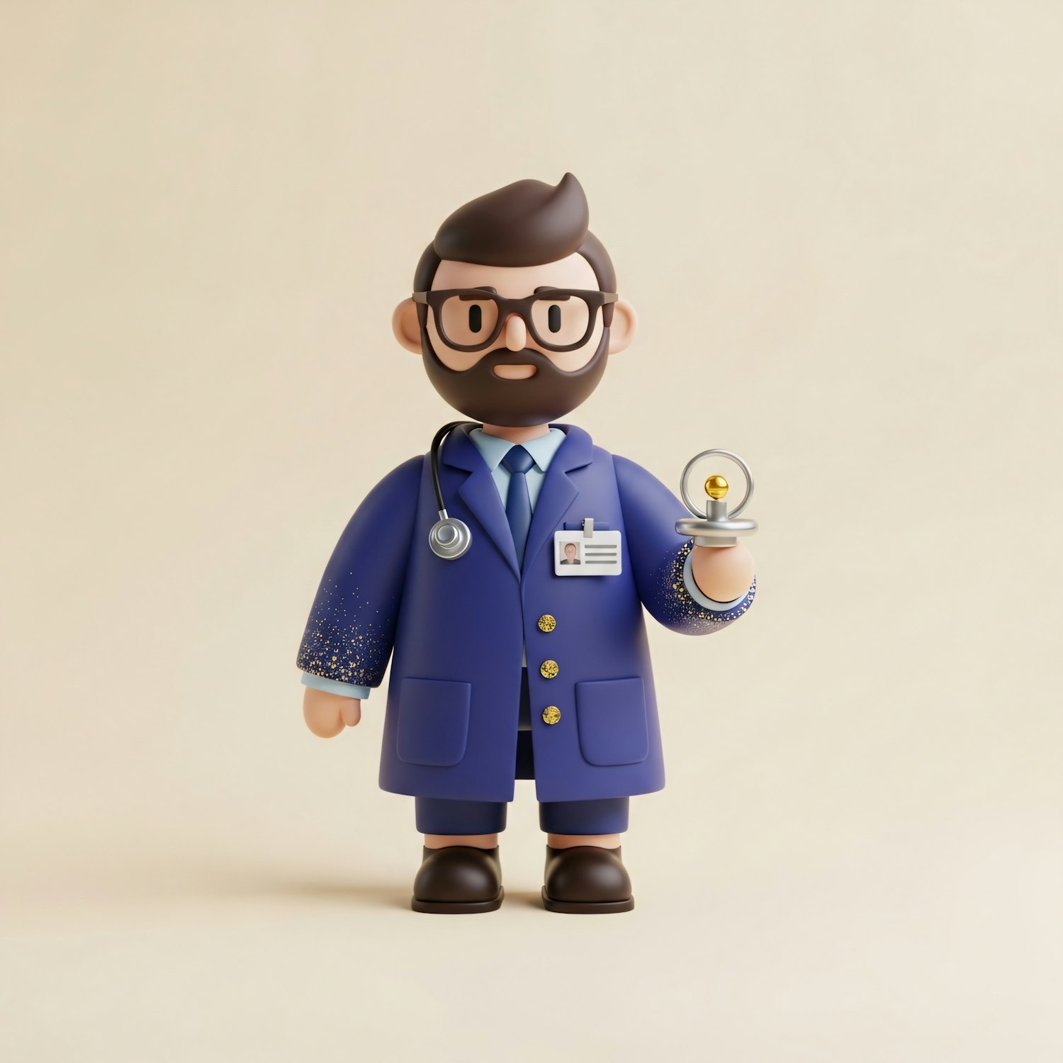 A 3D illustration of a cartoon doctor holding a lightbulb-like object, wearing a blue lab coat and glasses, with a stethoscope around his neck.