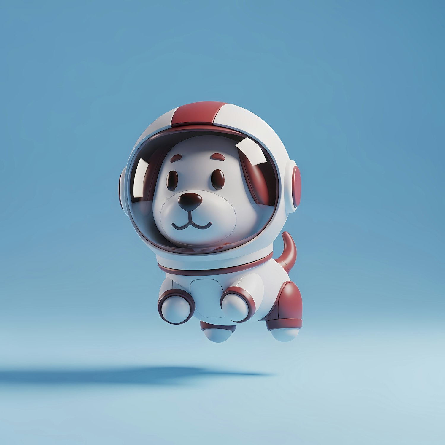 Adorable 3D cartoon dog in a red and white spacesuit, floating in a light blue background. Perfect for space-themed designs.