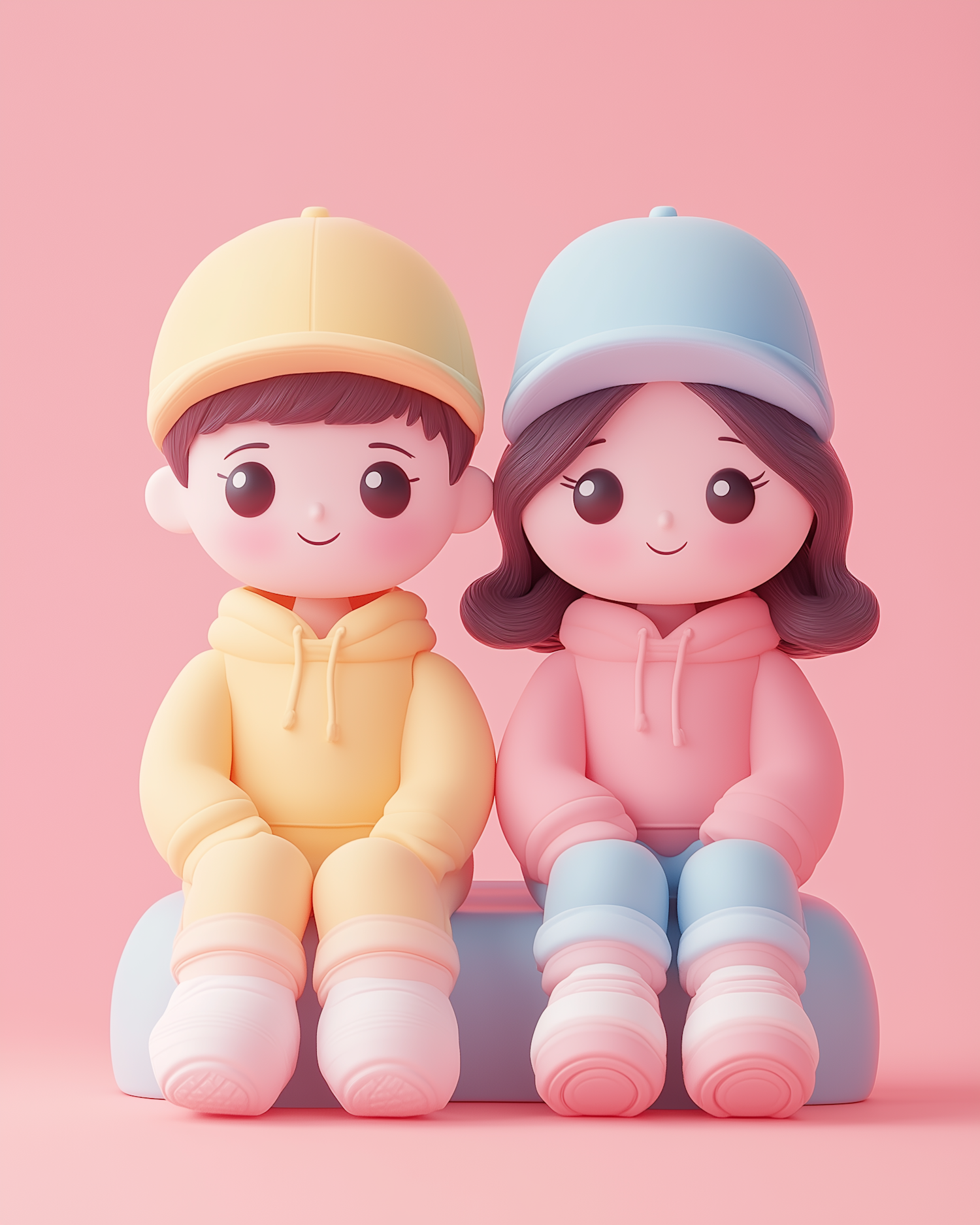 Adorable 3D cartoon characters in pastel hoodies and caps sitting on a bench, perfect for a cute and playful aesthetic.
