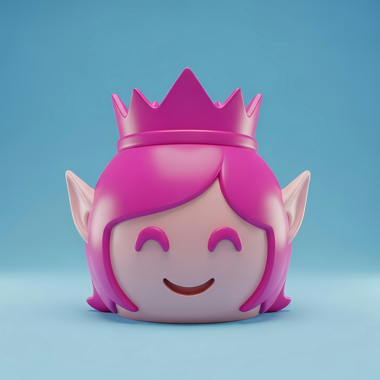 Adorable 3D cartoon character with pink hair, a crown, and elf ears, smiling cheerfully against a light blue background.