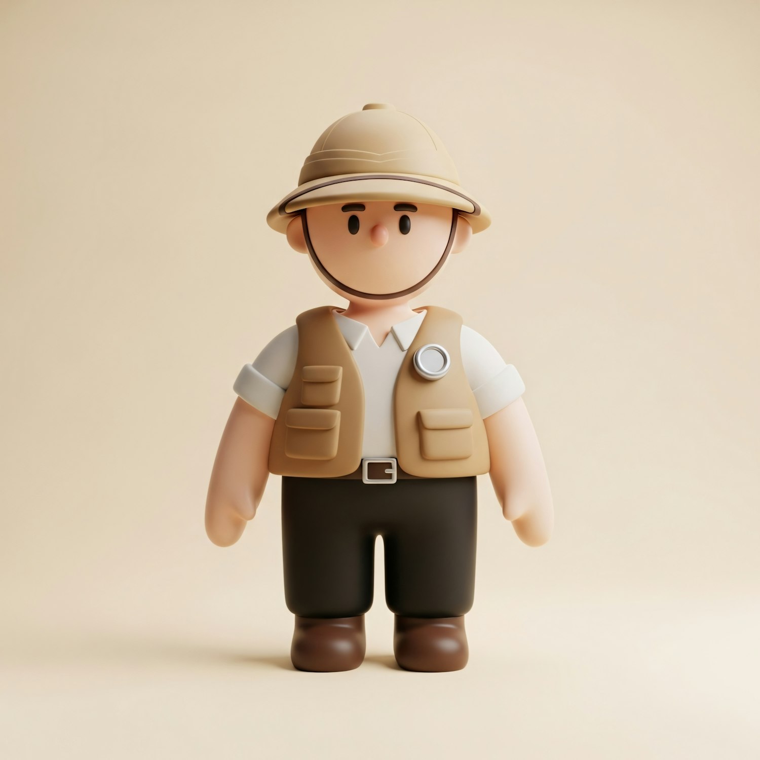 A cute 3D cartoon explorer character with a safari hat and vest, set against a light beige background.
