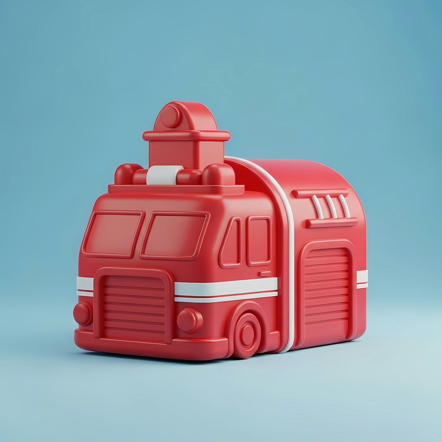 A vibrant 3D model of a red fire truck with white accents, set against a light blue background, showcasing a playful and stylized design.
