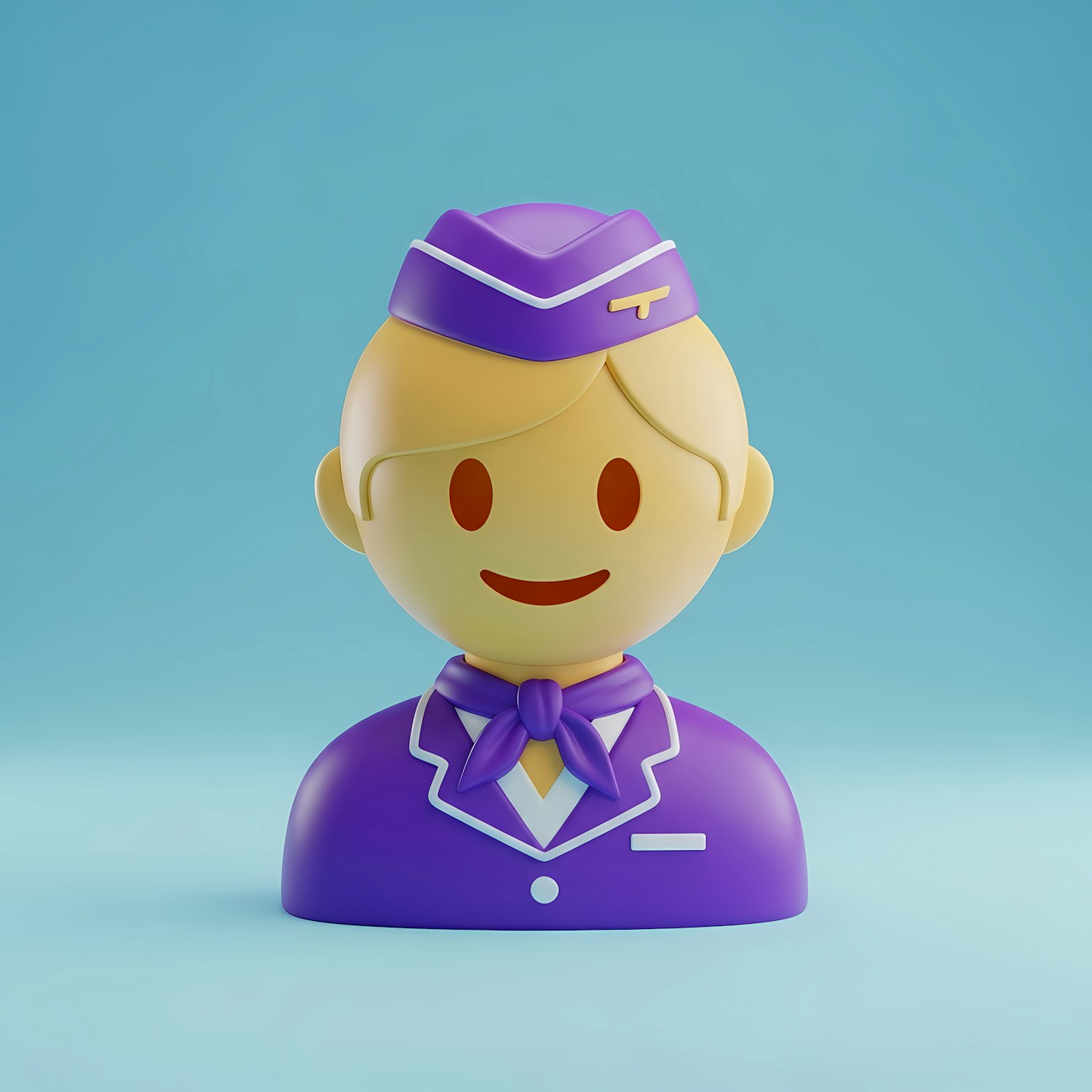 3D cartoon-style flight attendant in a purple uniform with a matching hat and scarf, set against a light blue background.