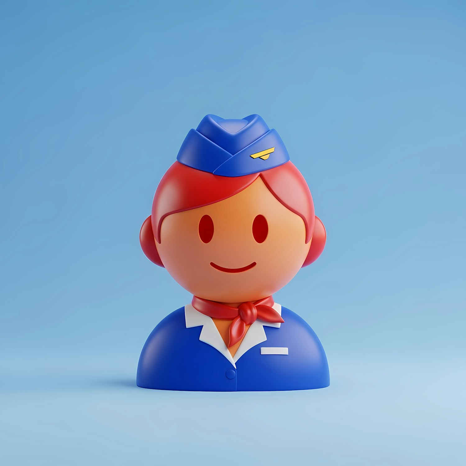 Cute 3D cartoon of a flight attendant in a blue uniform with a red scarf and hat, set against a light blue background.