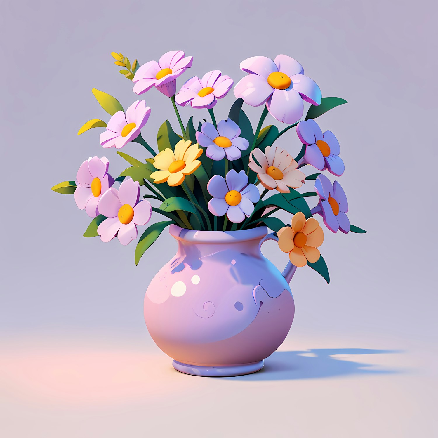 3D illustration of a lavender vase with colorful flowers, featuring purple, pink, and yellow blooms against a light gray background.