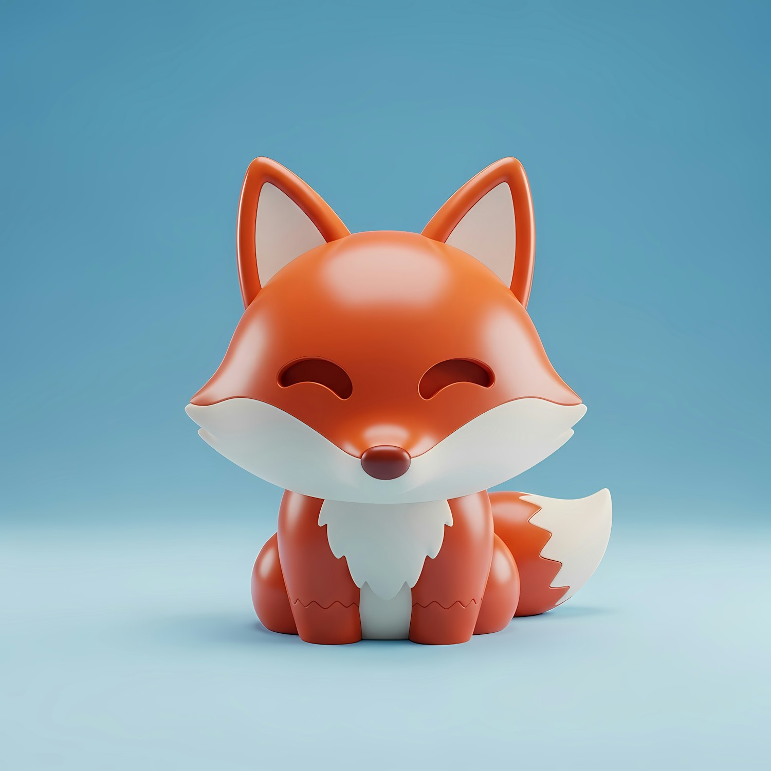 Adorable 3D cartoon fox with a cheerful expression, orange and white fur, sitting against a light blue background.
