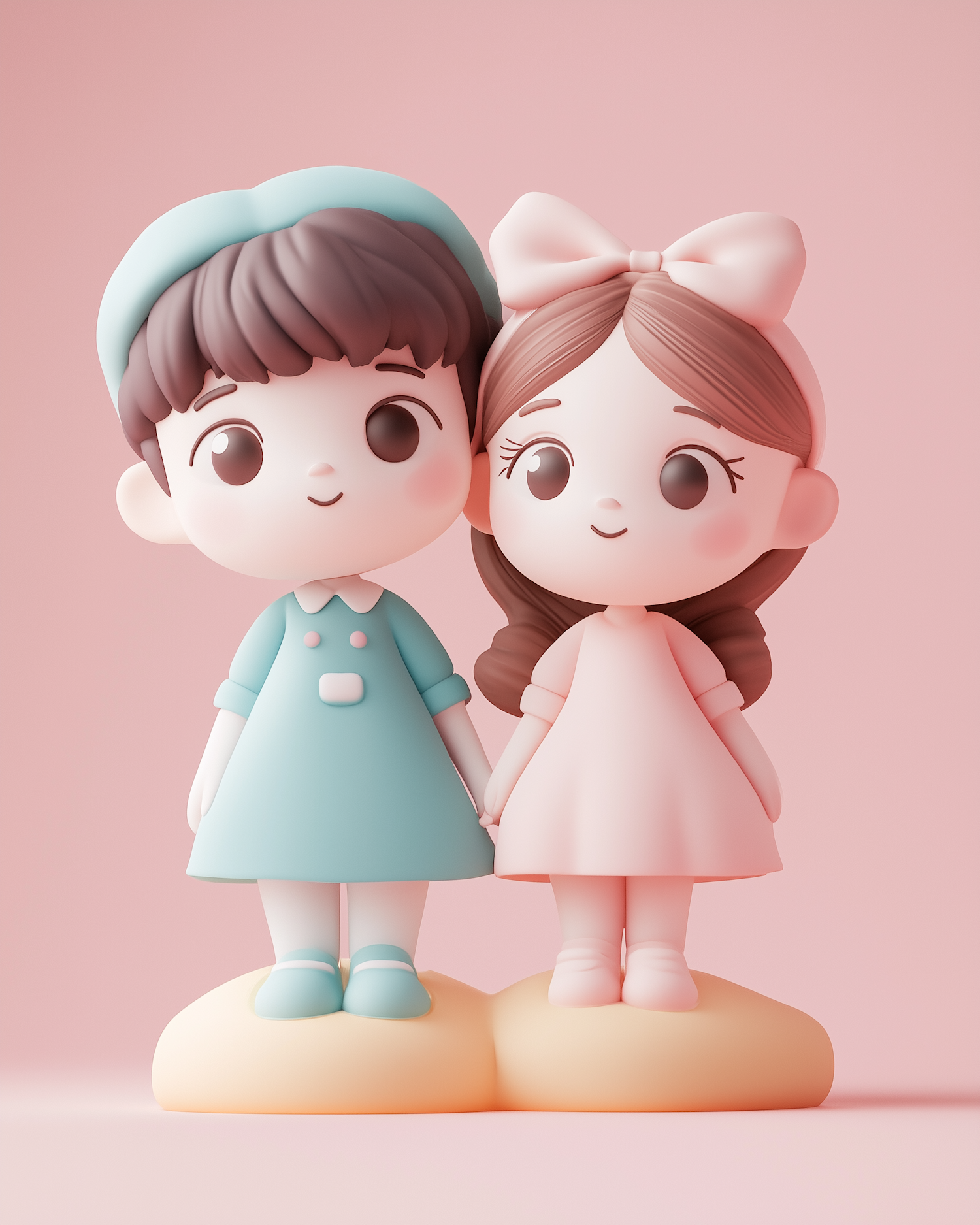 Adorable 3D cartoon boy and girl holding hands, dressed in pastel outfits with a soft pink background. Perfect for cute and playful themes.
