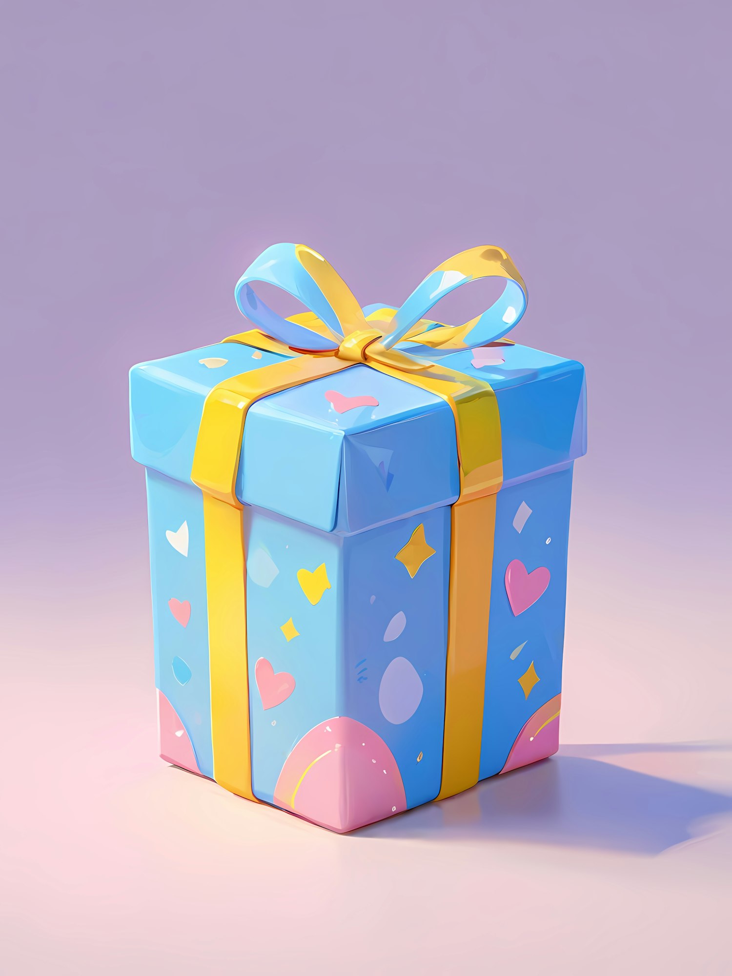 Bright blue gift box with yellow ribbon, pink hearts, and stars on a soft purple background. Perfect for festive or celebratory themes.