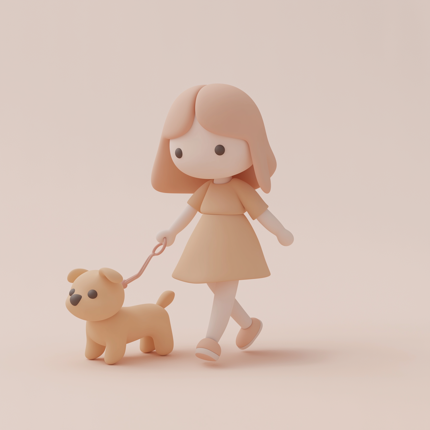 Adorable 3D illustration of a girl walking her dog, featuring soft pastel tones and a minimalist, cartoonish design.