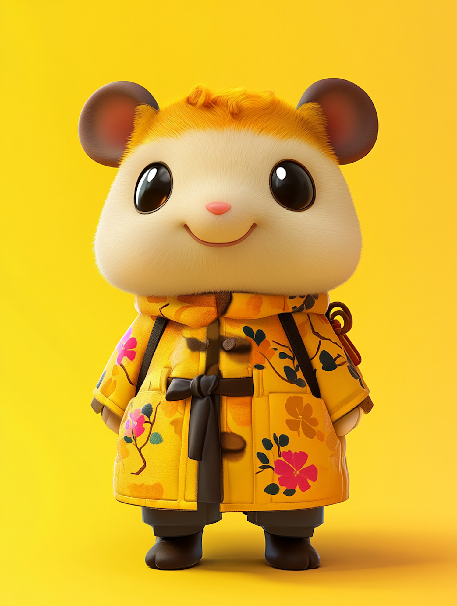 Adorable cartoon hamster in a floral yellow coat on a bright yellow background, exuding charm and playfulness.