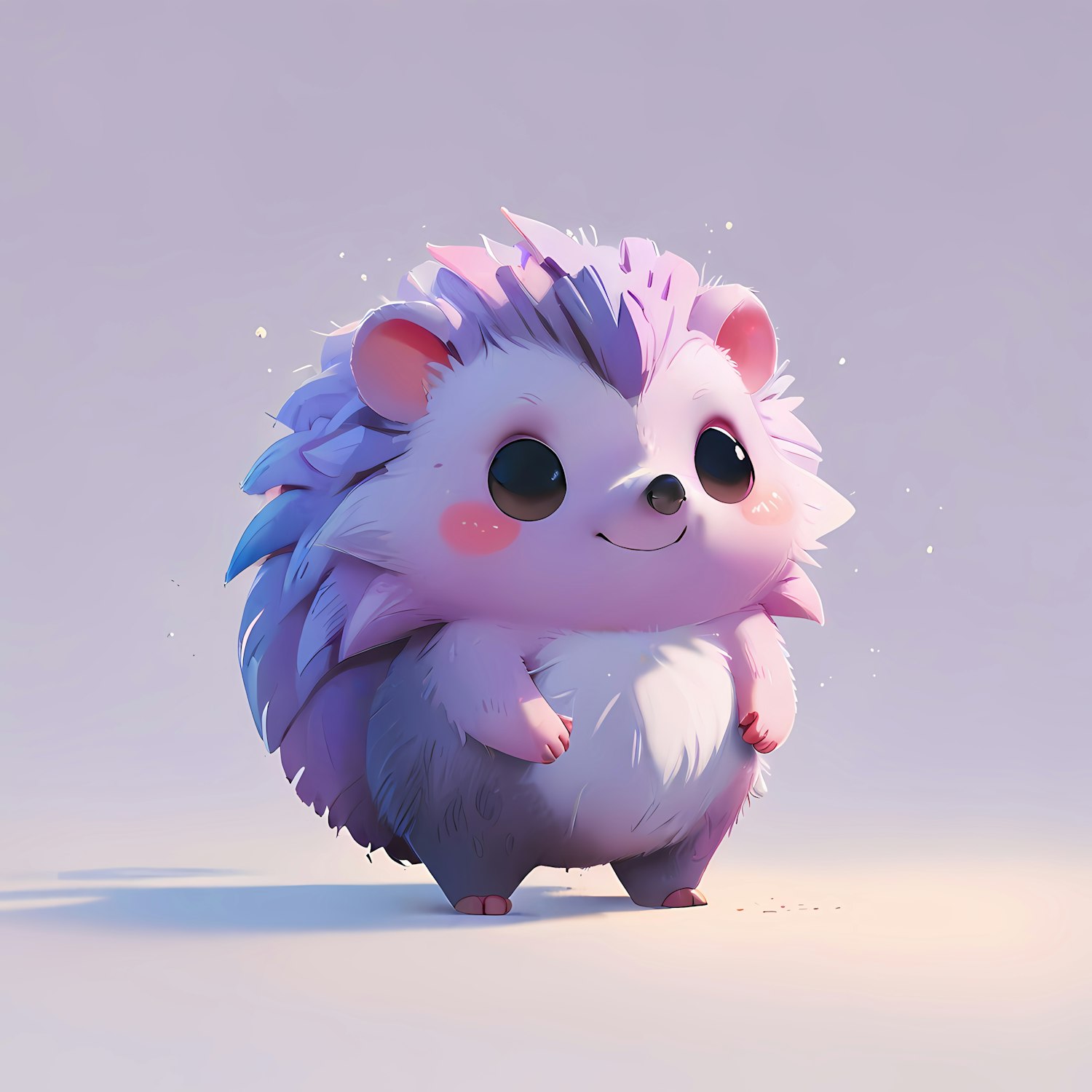 Adorable cartoon hedgehog with purple and pink quills, large eyes, and a sweet smile on a pastel background.