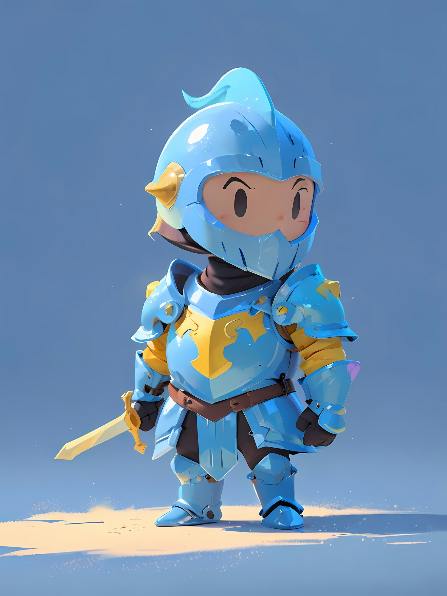 Adorable cartoon knight in shiny blue armor with golden accents, holding a sword. Perfect for fantasy or gaming themes!