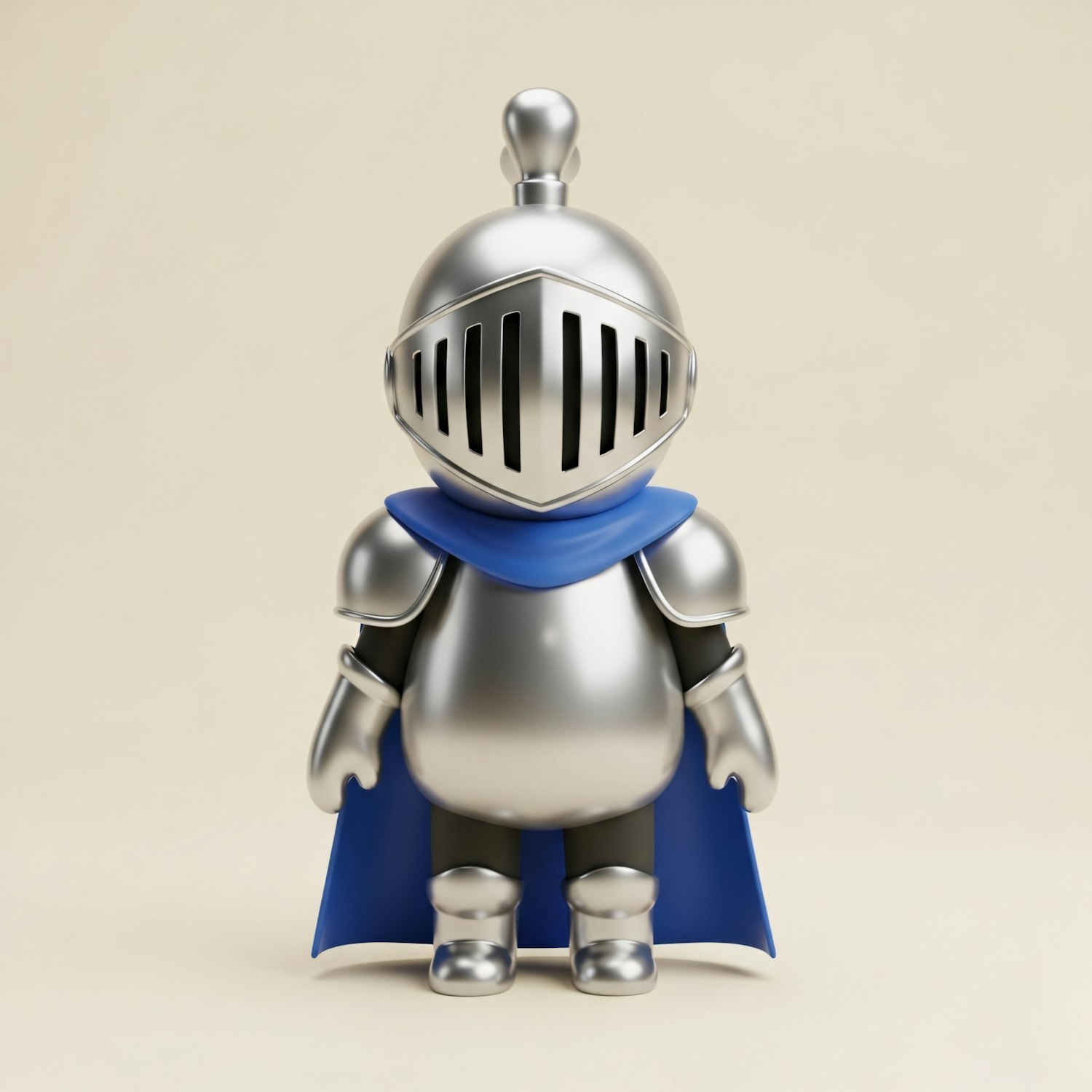 A cute 3D knight character in shiny silver armor with a blue cape, set against a neutral background. Perfect for creative projects.