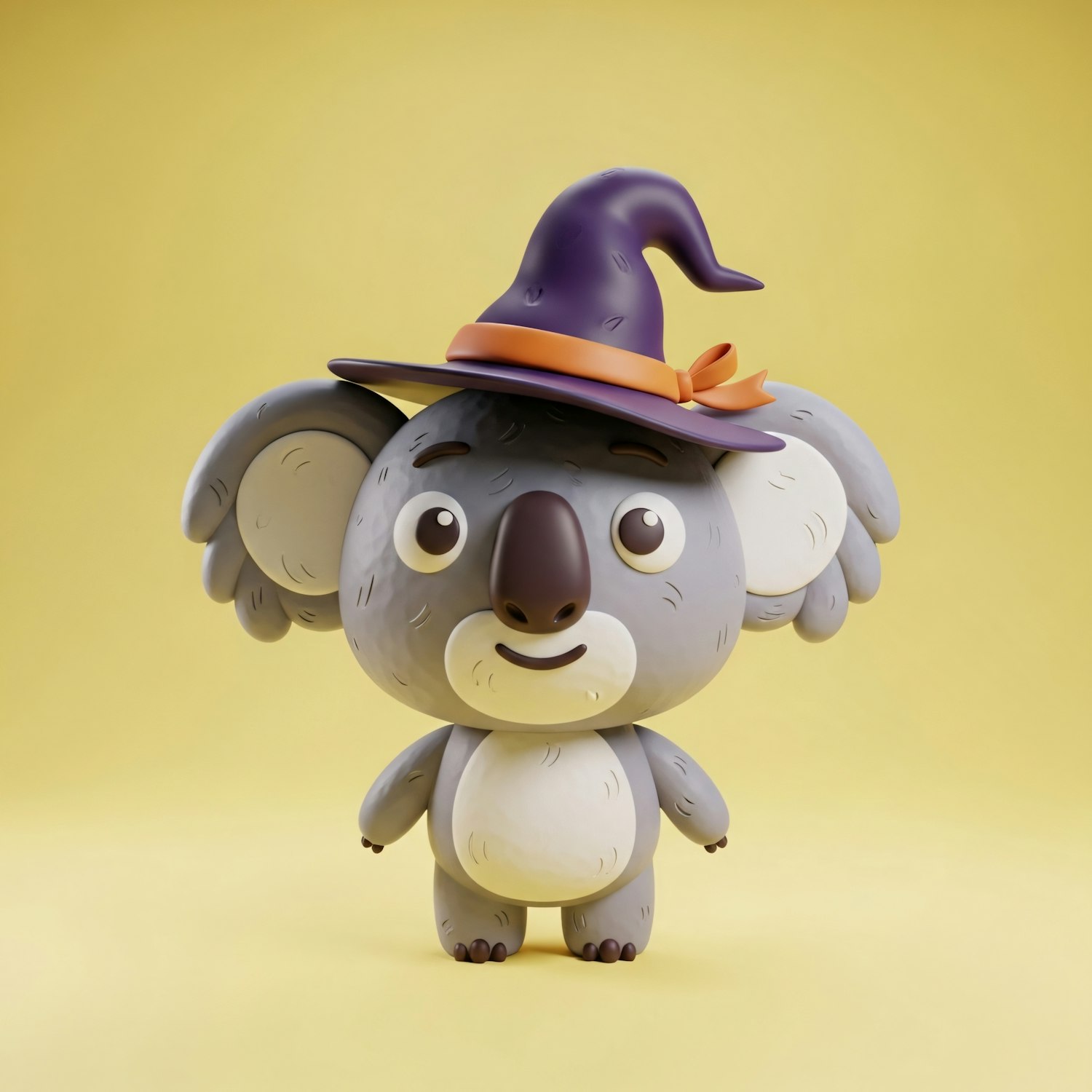 Adorable 3D cartoon koala wearing a purple witch hat with an orange ribbon, set against a cheerful yellow background.