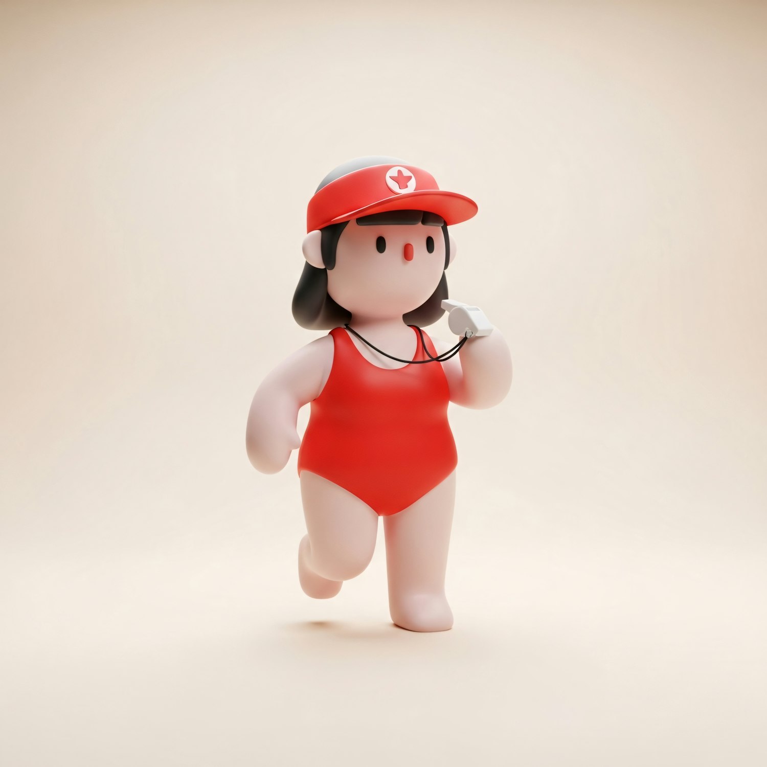 A cute 3D illustration of a lifeguard in a red swimsuit and cap, holding a whistle, set against a neutral background.