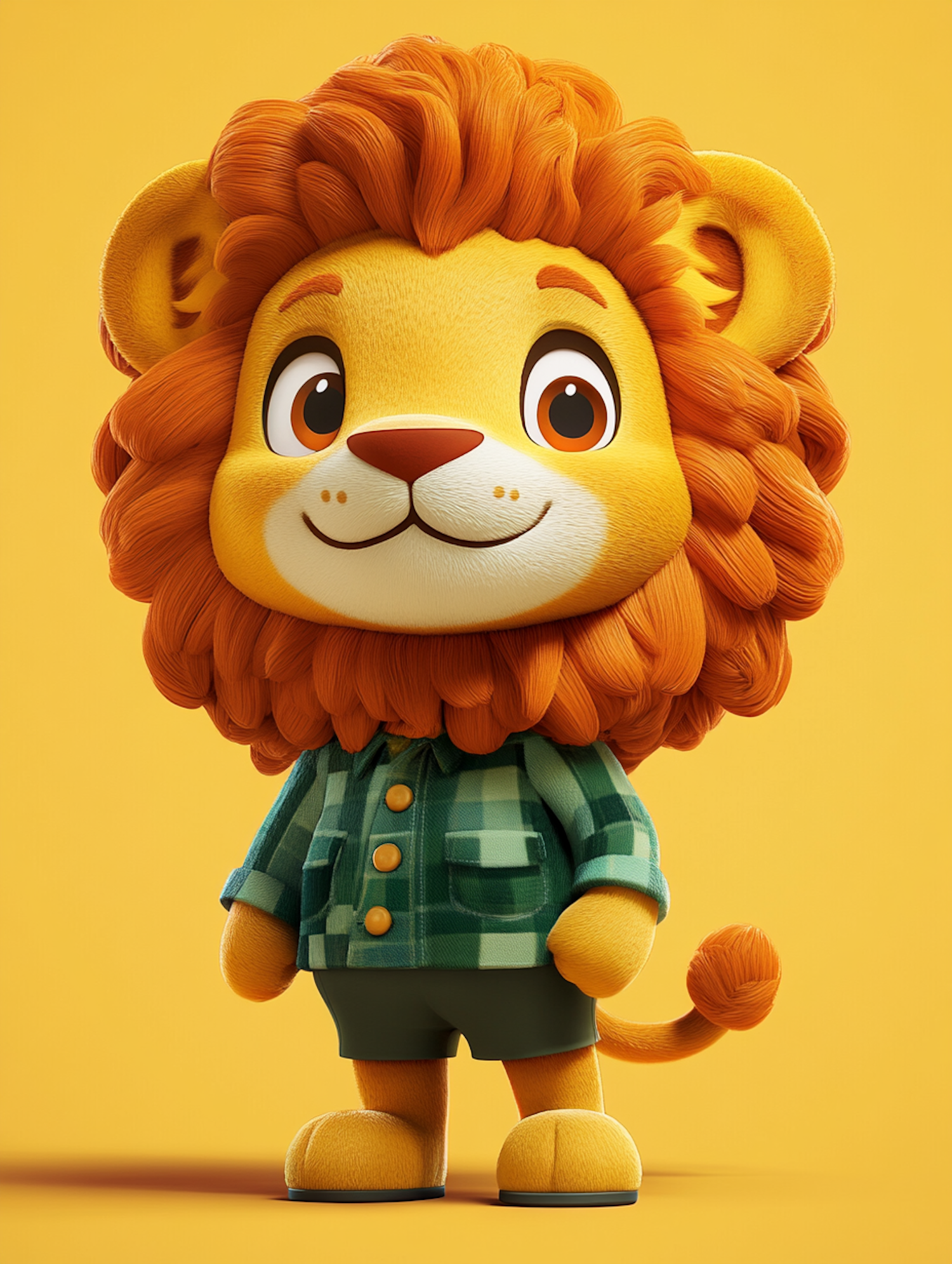 Adorable cartoon lion with a fluffy mane, wearing a green plaid shirt and shorts, set against a bright yellow background.