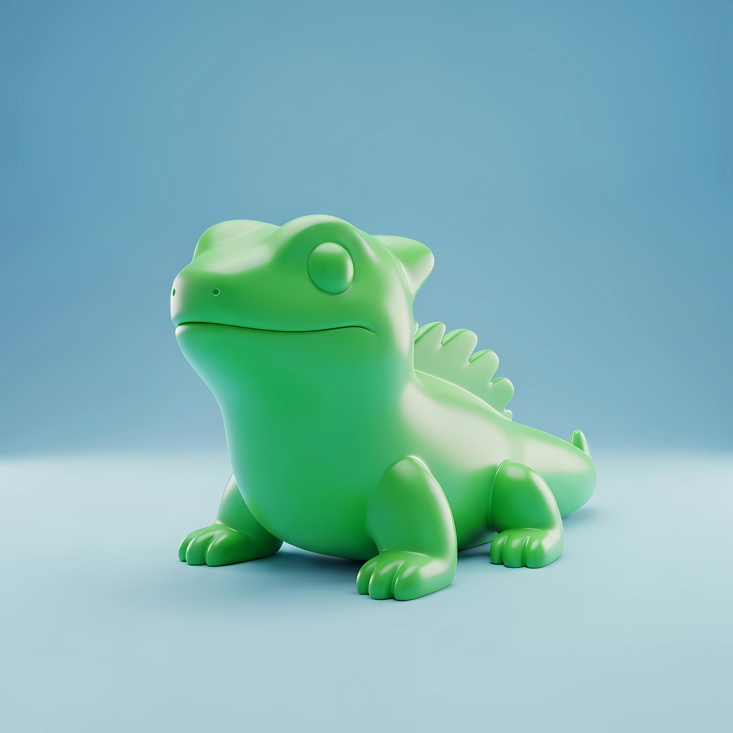 A cute green 3D lizard-like creature with a smooth, cartoonish design sits on a light blue surface against a gradient blue background.