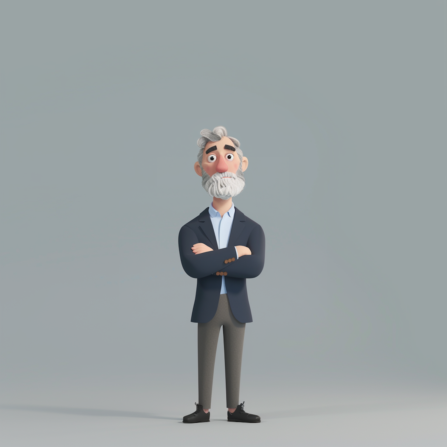 Stylized 3D illustration of a man with gray hair and beard, wearing a blazer and standing confidently with arms crossed.