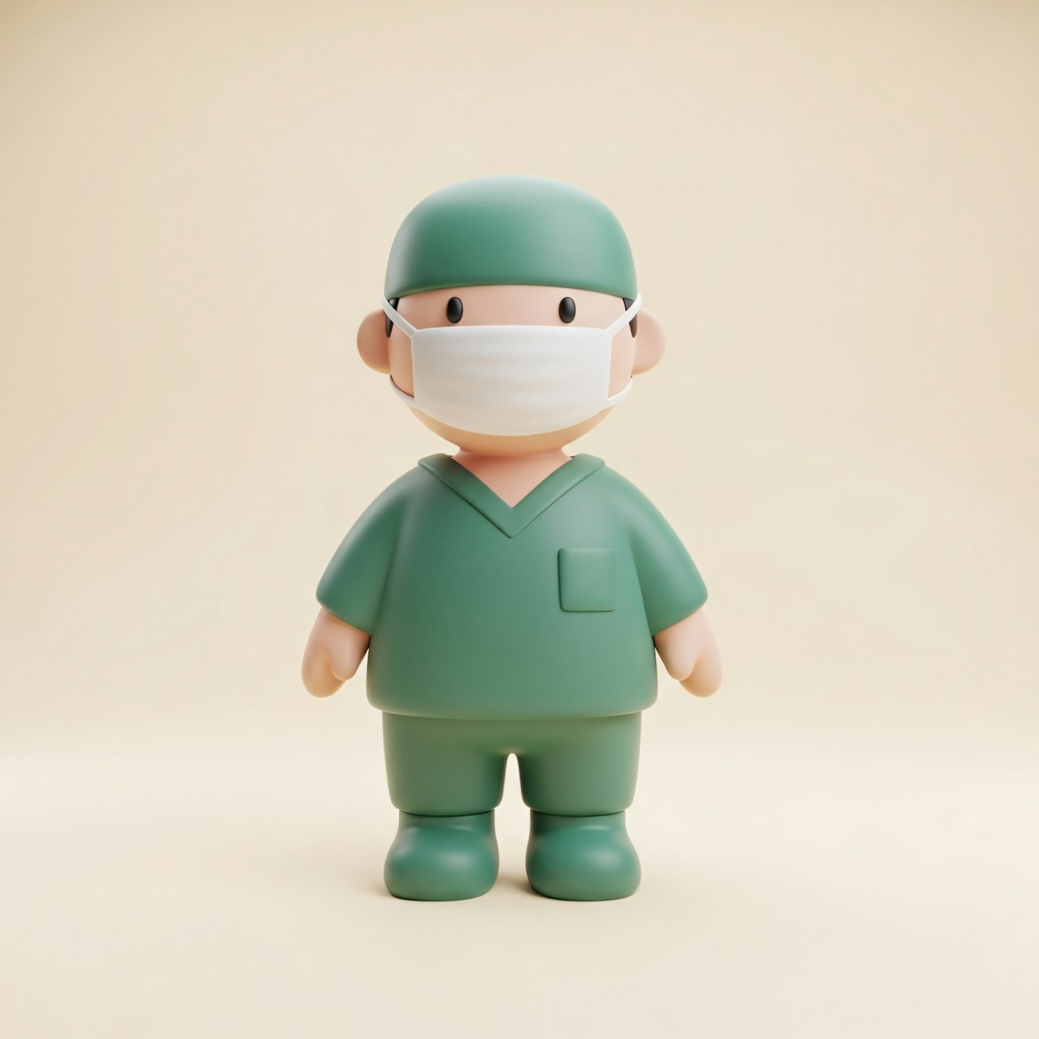 A cute 3D cartoon character in green scrubs and a mask, representing a healthcare worker, set against a neutral background.