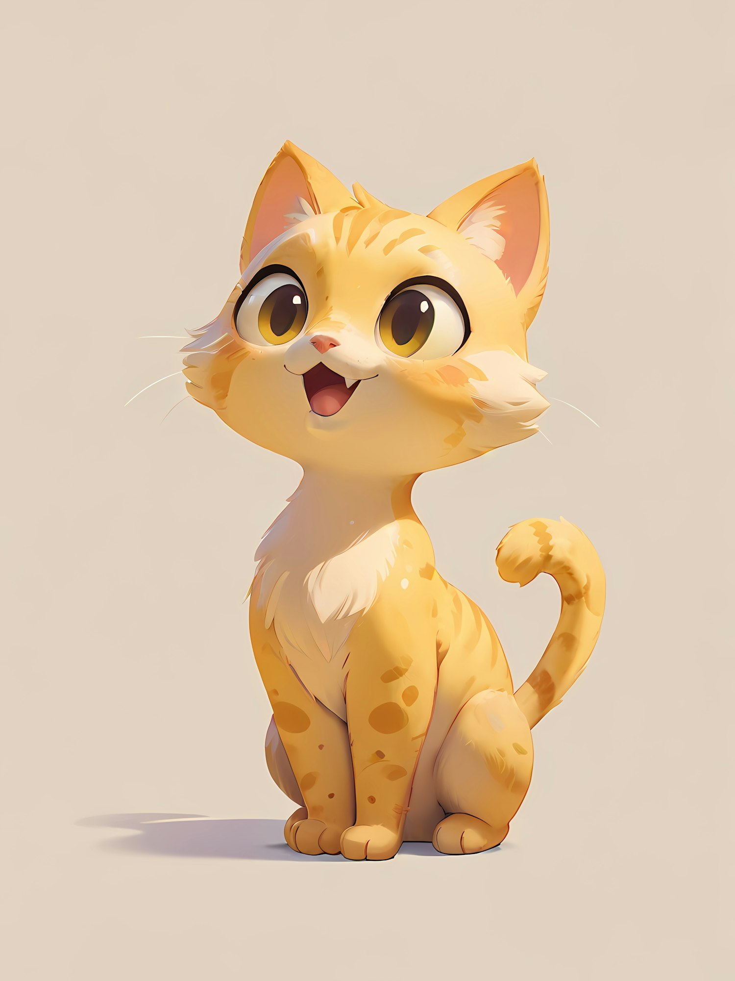 Adorable cartoon-style orange tabby cat with big golden eyes, a white chest, and a cheerful expression on a plain beige background.