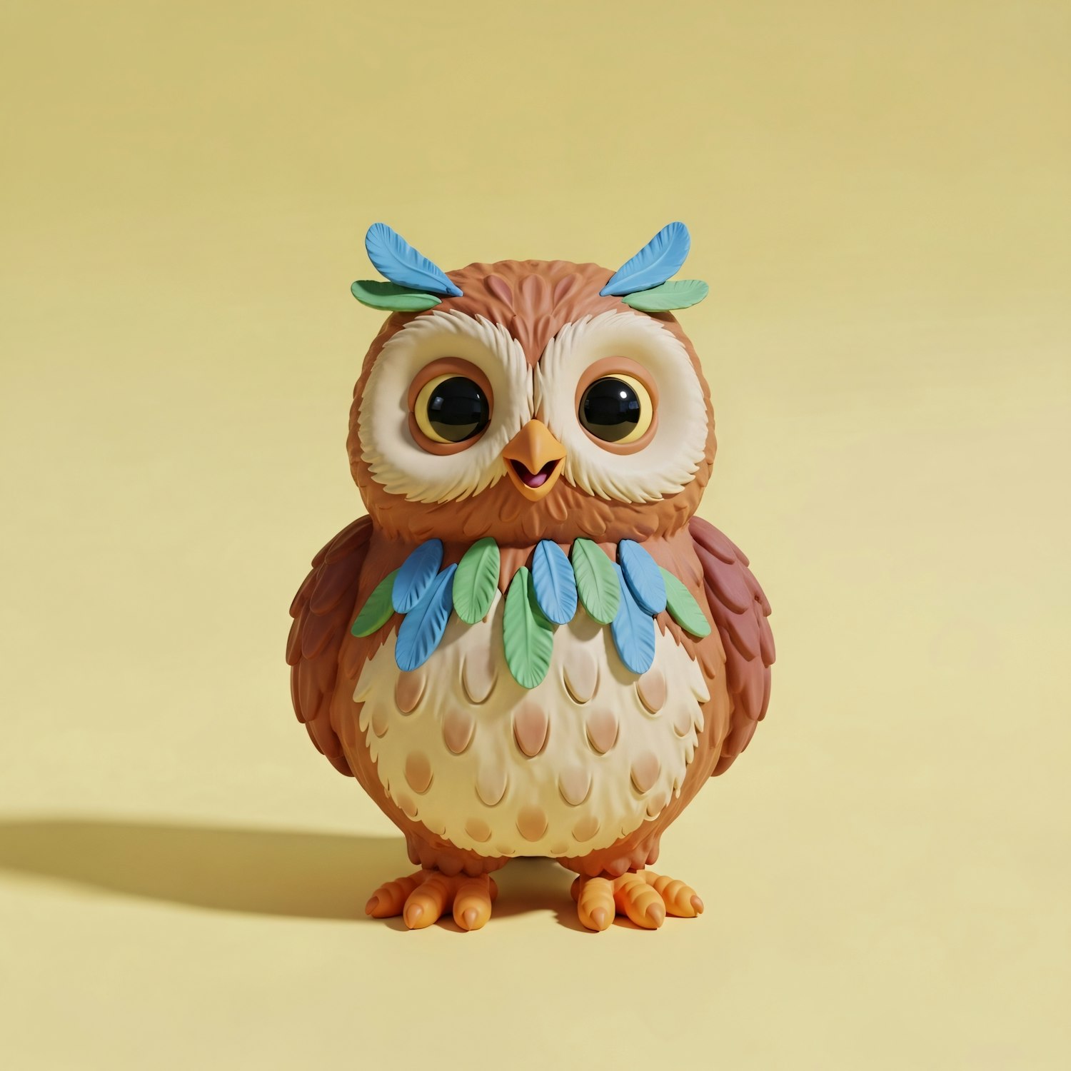 Adorable cartoon-style owl figurine with vibrant colors and large eyes, set against a soft yellow background.