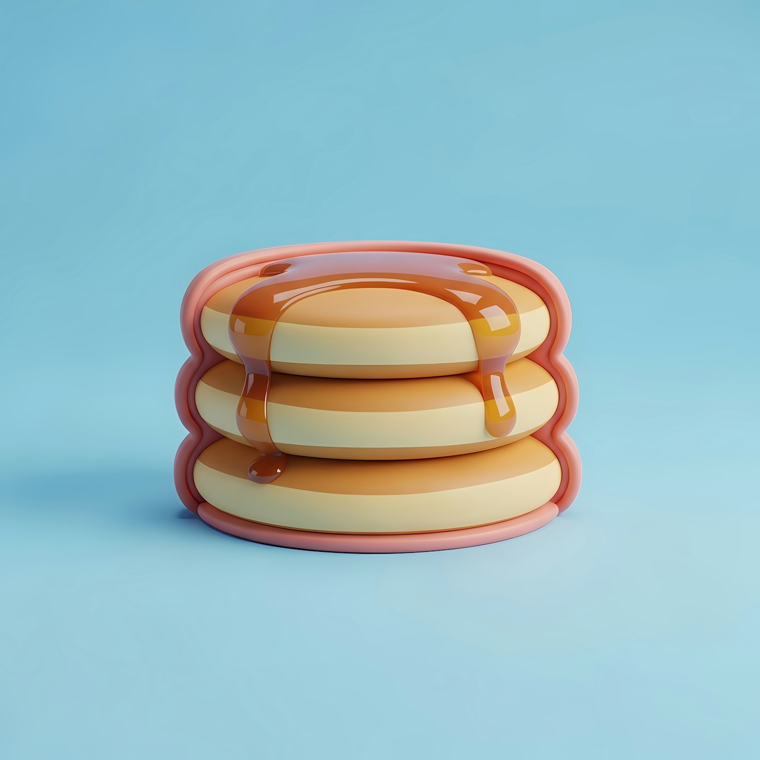 A playful 3D illustration of a pancake stack with syrup, set against a light blue background. Perfect for food-themed designs.