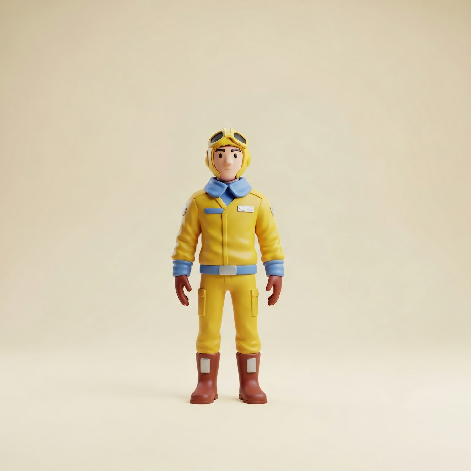 A cartoon-style figure in a yellow pilot outfit with goggles and boots, standing against a plain background.