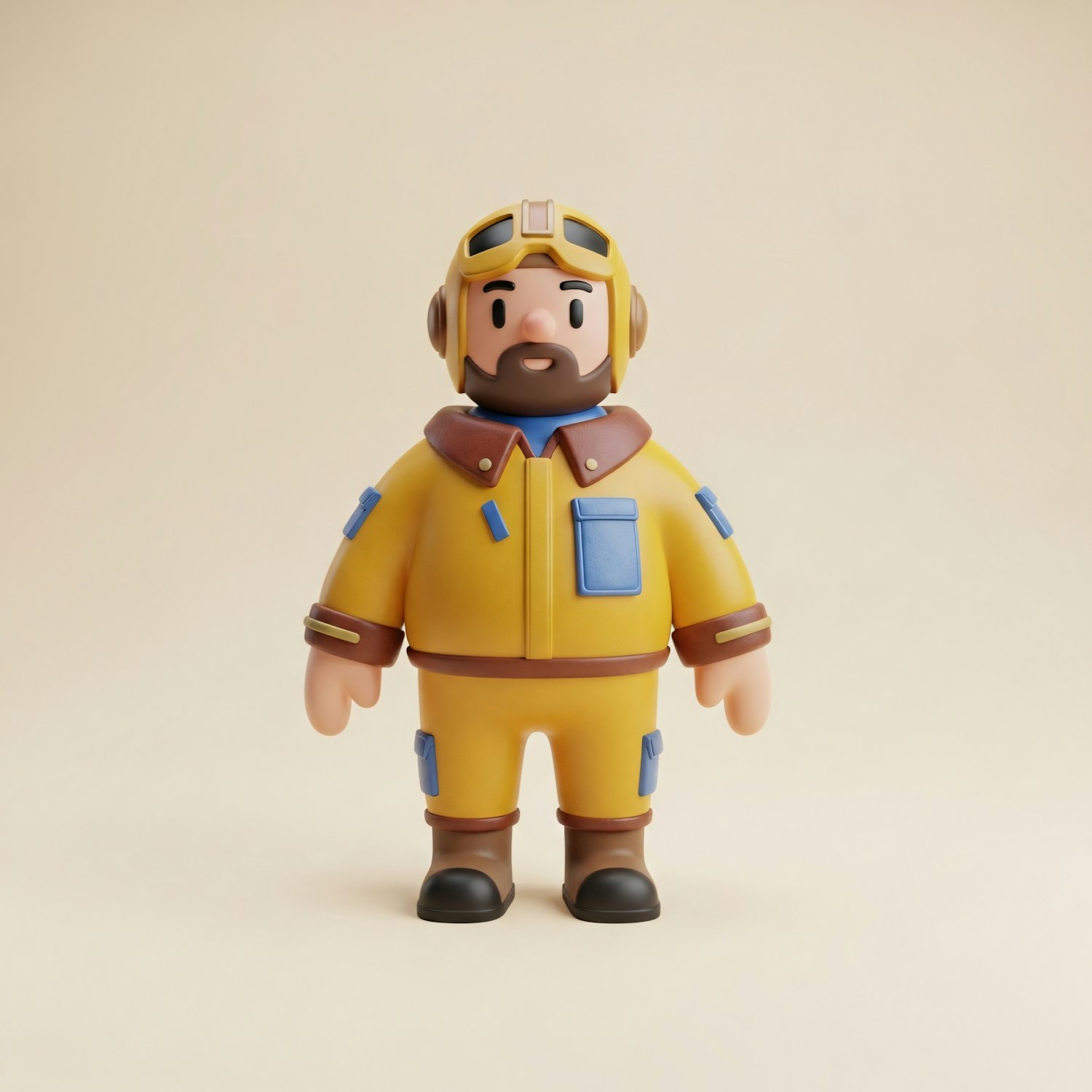 A 3D-rendered cartoon pilot in a yellow flight suit with brown and blue accents, set against a neutral background.