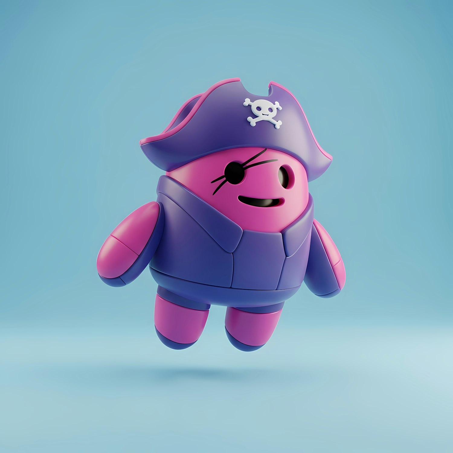 Adorable 3D pirate character with a pink body, purple hat, and eye patch, floating against a light blue background.
