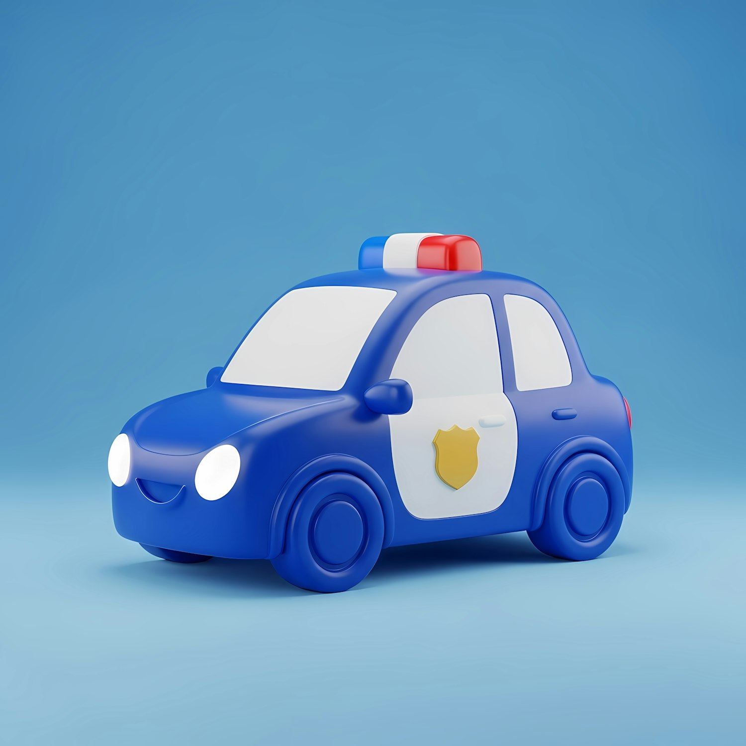 Adorable 3D cartoon police car with a blue body, white doors, and a red-and-blue light bar, set against a light blue background.