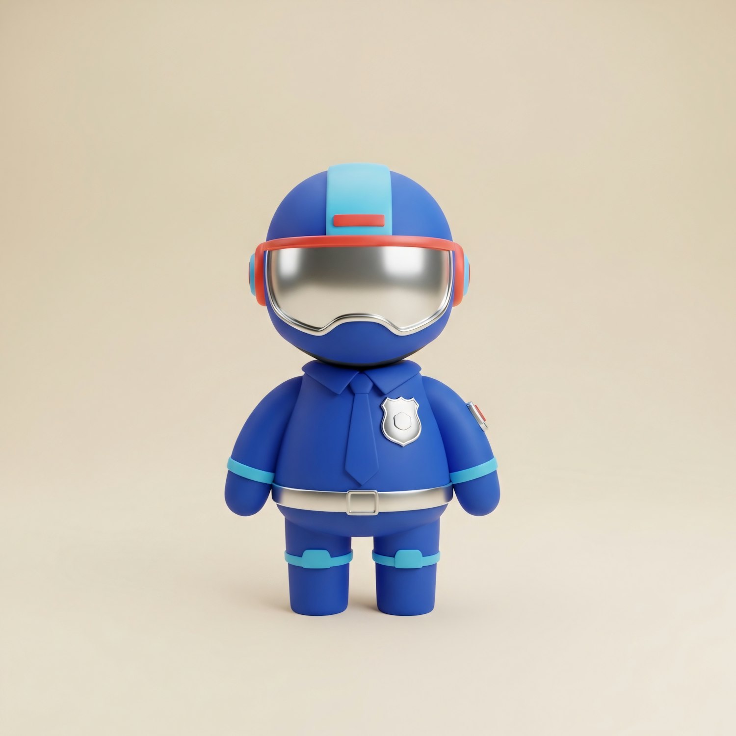 A cute 3D cartoon police officer in a blue uniform with a helmet and badge, set against a plain beige background.