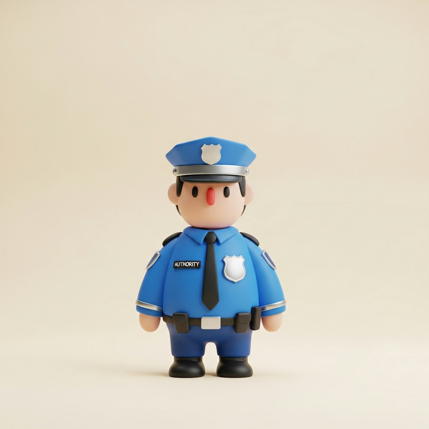 A cute cartoon police officer figure in a blue uniform with a badge and hat, set against a plain beige background.