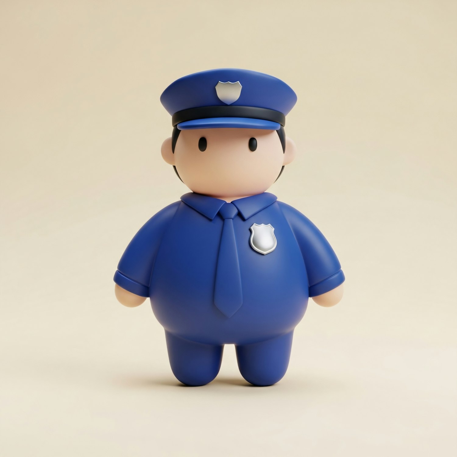 A cute 3D cartoon police officer in a blue uniform and cap, with a badge and tie, set against a neutral background.