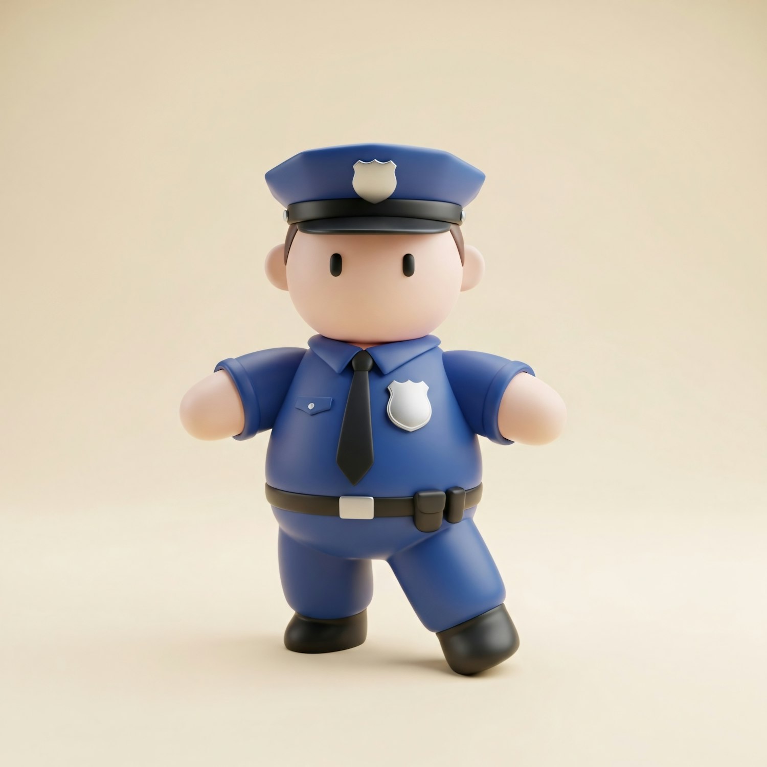 A cute 3D cartoon police officer in a blue uniform and hat, standing on a beige background. Perfect for fun or educational visuals.